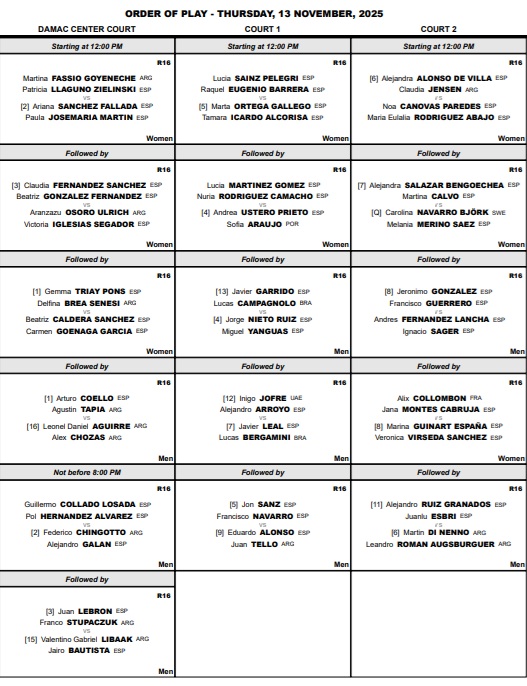 Lograron sacarlo adelante unos ‘Chingalán’ que están más cerca que nunca del número 1 – solo les separan 680 puntos en la Race de unos Arturo Coello y Agustín Tapia que vencieron en su debut por la vía rápida a la dupla de nacionalidad emiratí Icardo-Jurado. También ganaron en dos sets el resto de las parejas ‘top’, como Lebrón-Stupaczuk (#3), en el que es su último torneo juntos, así como Nieto-Yanguas (#4), Navarro-Sanz (#5) y Di Nenno-Augsburger (#6).