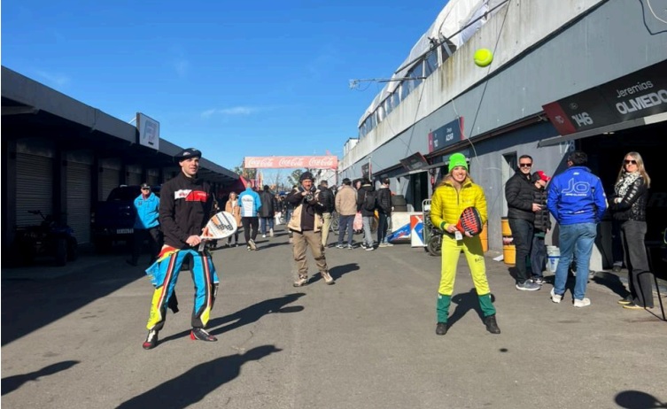 El piloto de Rivera realizó un calentamiento en los boxes del autódromo probando las nuevas paletas Onyx de Bullpadel y aprovechó para regalar gorras y accesorios al público y a sus compañeros de parrilla.