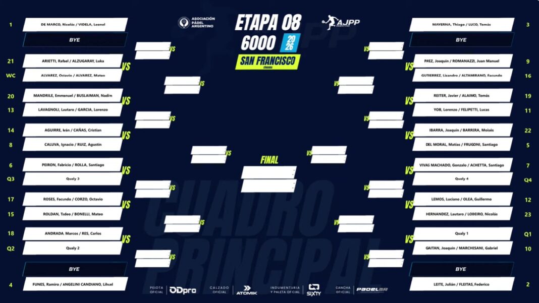 El cuadro se presenta durísimo, como nos viene acostumbrando el calendario 2026 del circuito AJPP. Como pareja uno, en lo más alto del mismo, se ubican Nicolás De Marco y Leonel Videla. En la otra punta, como dos, se encuentra la pareja conformada por Julián Leite y Federico Fleitas. En esa parte del cuadro, como número 3, están Thiago Mayerna y Tomás Luco, mientras que la dupla 4 es la integrada por Ramiro Funes y Lihuel Angelini. Estas 4 parejas comienzan a competir el sábado directamente desde los octavos de final.