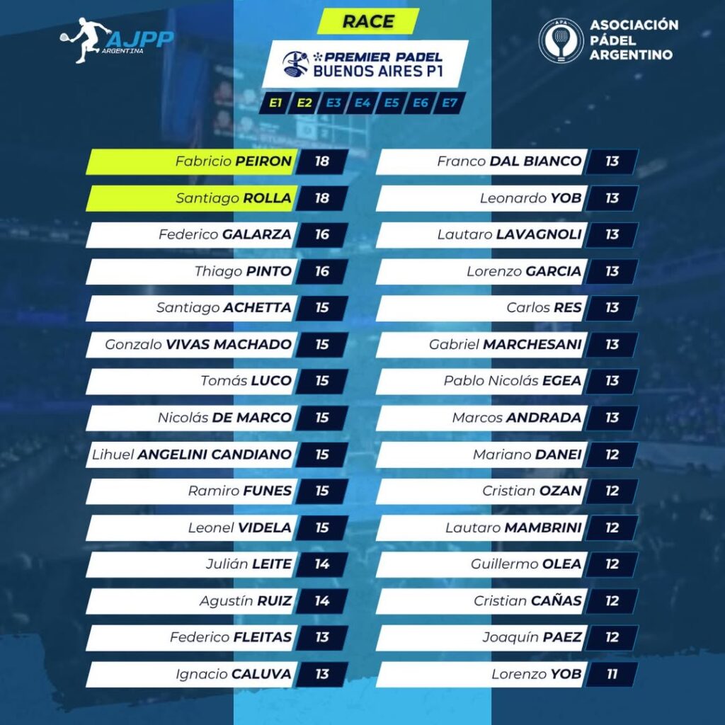 El de La Plata fue el segundo de siete grandes torneos acordados con la Asociación de Pádel Argentino (APA) que conforman la race para ingresar al P1 que se disputa en mayo en nuestro país. En este momento Peirón y Rolla encabezan la lista, seguidos de Galarza y Pinto, pegaditos Achetta y Vivas Machado, Luco y De Marco, Angelini, Funes, Videla, Leite y los nombres continúan, todo realmente muy parejo.