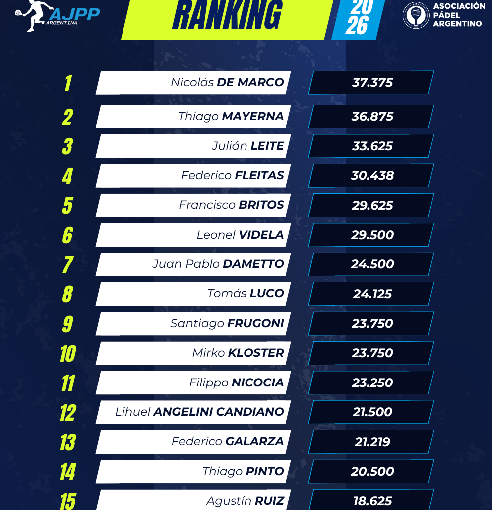 En el segundo lugar del ranking del pádel argentino se mantiene aún Thiago Mayerna, seguido a pocos puntos por Julián Leite, quien completa el podio. En cuarto lugar, se encuentra Federico Fleitas, que este fin de semana acompañará al joven talento del pádel local, Santino Contreras. Quinto se ubica Francisco Britos y sexto Leonel Videla.